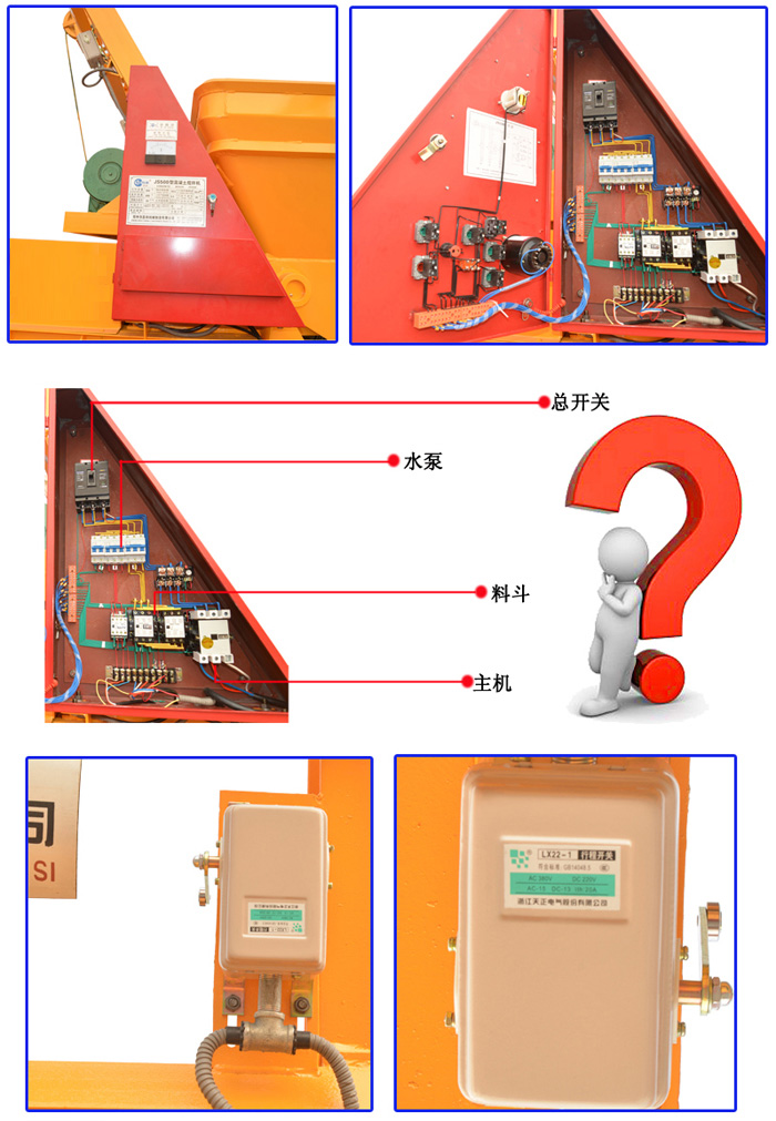 JS2000攪拌機電控系統有空氣開關、熔斷器、熱繼電器,有短路保護、過載保護的功能。所有控制按鈕及空氣開關手柄和指示燈均在配電箱門上,并設有門鎖。按鈕上有防護罩。配電箱內的電器元件裝在一塊緣板上,安全可靠,操作維修方便。